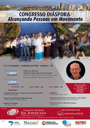Acontece no período de 21 a 22 de outubro, no campus da Faculdade Teológica Sul Americana (FTSA), um encontro que tratará do tema “Diáspora: Alcançando Pessoas em Movimento”. O congresso contará com a presença de John Baxter, Catalisador Internacional da Global Diáspora Network do Movimento Lausanne, além de líderes e missionários de várias agências brasileiras (como Sepal, Miaf, Missão Mais e outros), e profissionais com experiência internacional.Existem mais de 232 milhões de pessoas deslocadas no mundo. Toda nação tem sido impactada com o fenômeno de movimento de populações. Essa diáspora representa tanto uma força missionária quanto uma oportunidade de alcançar os povos que chegam a nossas vizinhanças. Diante deste cenário, o objetivo do congresso é capacitar igrejas e profissionais para realizarem o ministério com pessoas em diáspora.