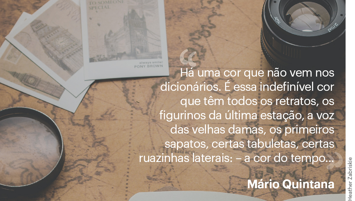 Há uma cor que não vem nos dicionários. É essa indefinível cor que têm todos os retratos, os figurinos da última estação, a voz das velhas damas, os primeiros sapatos, certas tabuletas, certas ruazinhas laterais: -- a cor do tempo...Mário Quintana