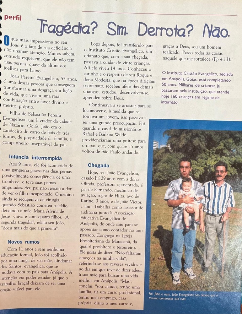 Hoje, seu João Evangelista, casado há 29 anos com a dona Olinda, professora aposentada, é pai de Fernando, mecânico de aviação, sogro de Hilza, avô de Karine, 3 anos, e de João Victor, 1 ano. Trabalha como assessor de auditoria junto à Associação Educativa Evangélica de Anápolis, de onde saiu para se aposentar como contador no ano passado. Congrega na Igreja Presbiteriana do Maracanã, da qual é presbítero e tesoureiro. Ele gosta de dizer: “Não faltaram emoções na minha vida”, referindo-se aos reveses vividos e ao dia em que teve de dizer adeus à sua mãe para buscar uma vida melhor em Anápolis. “Mas”, conclui, “sou casado, tenho uma família, fiz um curso profissional, tenho meu emprego, casa própria, dirijo o meu carro e, graças a Deus, sou um homem realizado. Posso todas as coisas naquele que me fortalece (Fp 4.13.).”