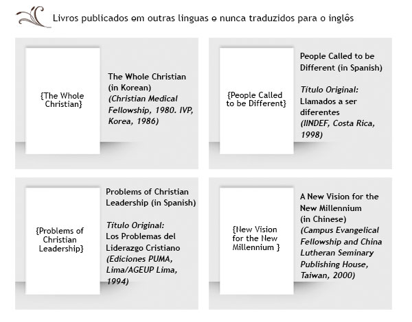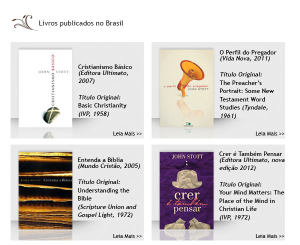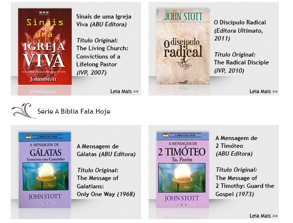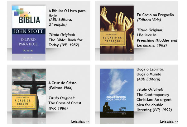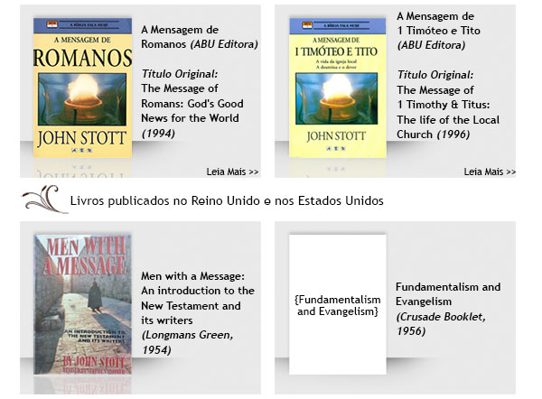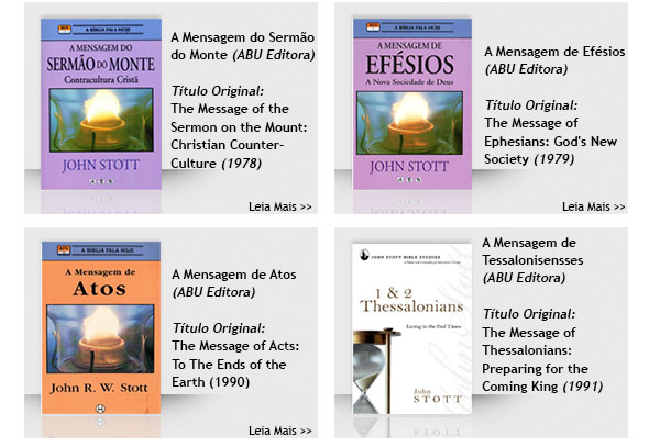 Alguns livros já foram publicados no Brasil, tais como The Epistles of John (na série Cultura Bíblica, da Edições Vida Nova), Men with a message (Editora Cristã Unida) e, se não estou enganado, houve um livro publicado pela Vinde sobre sexualidade e outro sobre as cartas às sete igrejas da Àsia (editora ignorada). Há algum projeto para relançar tais livros ou os livros do catálogo da ABU?