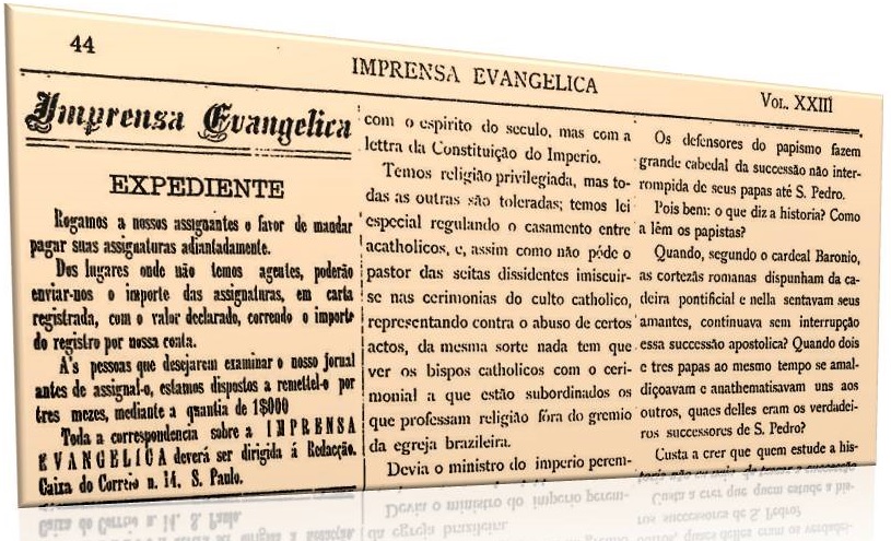 Era impresso no Rio de Janeiro e saía de quinze em quinze dias. Entre os leitores do Imprensa Evangélica, estavam a mãe do senador Saldanha Marinho, o filho do Regente Feijó, alguns padres e outras pessoas de influência na época.