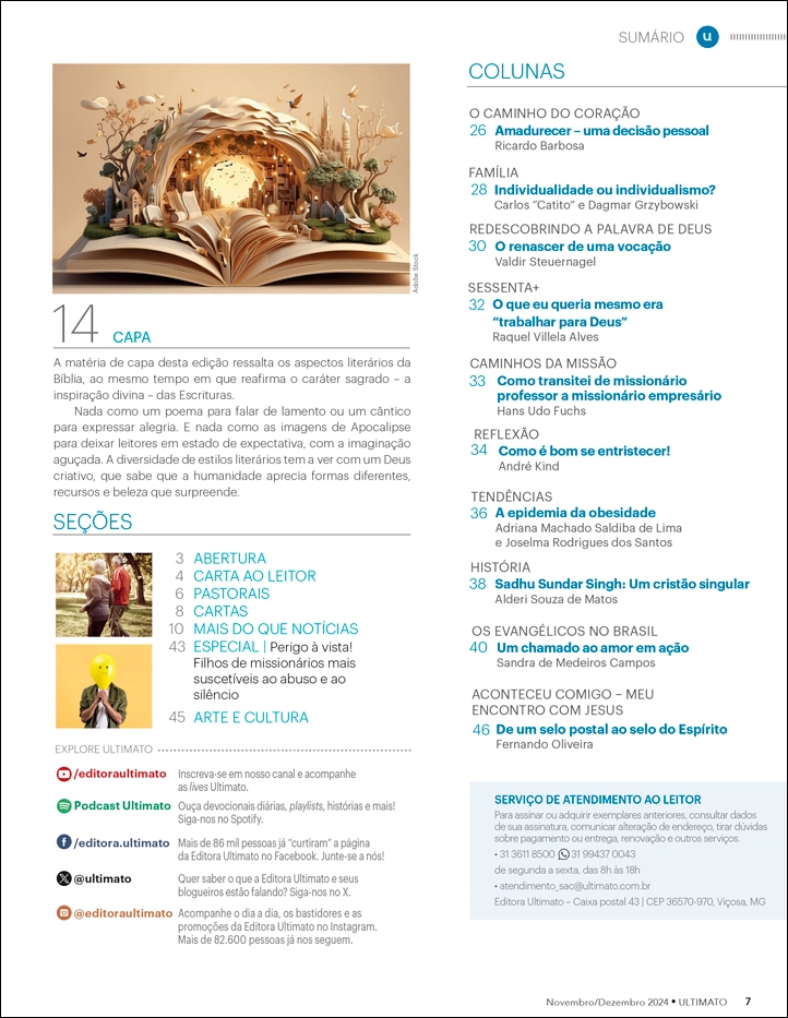 Na capa da edição 410: Bíblia — Revelação e Literatura. Enfim, por que ler a Bíblia também como literatura?Ultimato mostra, entre outras coisas, a riqueza das Escrituras quando lidas como literatura, sem diminuir o seu caráter sagrado — a sua inspiração divina.