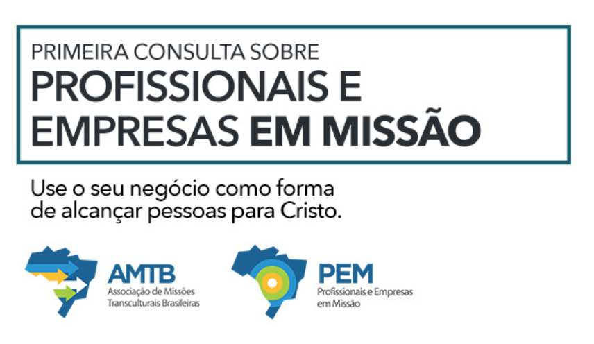 O departamento de Profissionais e Empresas em Missão (PEM) da AMTB, (Associação de Missões Transculturais Brasileiras) promove, em 08 de dezembro, a 1ª Consulta sobre Profissionais e Empresas em Missão.O evento é voltado para agências que possuem interesse ou projetos de Tentmaking (fazedores de tendas) ou BaM (Business as Mission), com empreendedores e investidores que querem usar suas vocações para servir o não-alcançado.