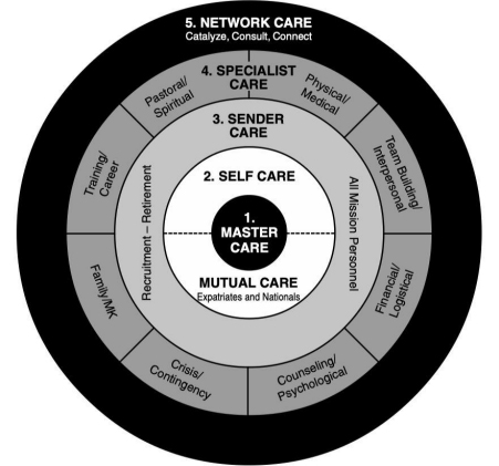 Cada uma das 5 esferas é permeável e o cuidado pode fluir entre elas. Estão incluídas as fontes de cuidado aos membros, por exemplo, quem envia – igreja ou organização missionária – assim como os tipos de cuidado, por exemplo, família e TCKs (Crianças de terceira cultura). No centro do modelo está o Master Care [Cuidado principal], reconhecendo que Deus é a fonte principal de cuidado, é quem nos fortalece. E é ele a quem servimos.