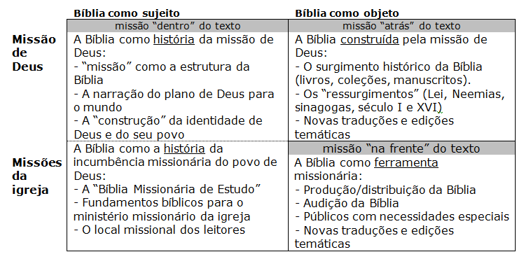 Não coloquei a palavra “Bíblia” entre aspas porque já pressuponho a delimitação protestante dos livros da Bíblia. Mesmo assim, a resposta para a nossa pergunta (de que maneira a Bíblia é missionária?) depende de como se entende a Bíblia nesta relação: como o sujeito da conversa com “missões” ou como o objeto da conversa? Para ajudar, estou propondo quatro maneiras de relacionar “missões” ou “missão” com a Bíblia: