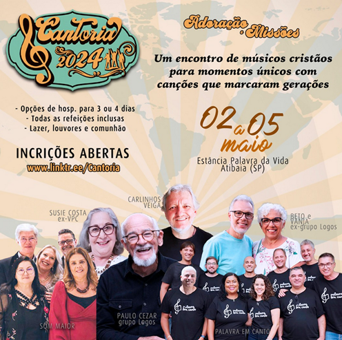 Cantoria 2024 é um evento que reunirá grandes nomes da música cristã brasileira para momentos de comunhão, louvor, aprendizado e muita descontração entre os dias 2 e 5 de maio, em São Paulo.Entre os músicos e grupos convidados estão Carlinhos Veiga, Susie Costa (ex Vencedores Por Cristo), Som Maior, Beto e Vanja (ex grupo Logos), Palavra em Canto, Paulo Cézar. E as mensagens e devocionais ficarão por conta do pastor Sidney Machado, reitor do Seminário Bíblico Palavra da Vida.
