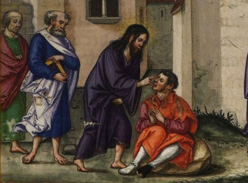 Imagem: Detalhe de Manuscrito medieval em miniatura. Cura do homem nascido cego, João 9:1-38. Domínio público. Picryl.