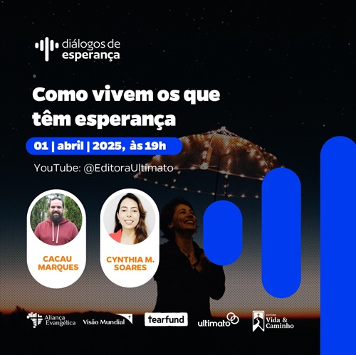 “Como vivem os que têm esperança”. Este é o tema da primeira live do ano, que será realizada no próximo dia 01 de abril (terça-feira), às 19h, no canal da Ultimato no YouTube. Os entrevistados convidados serão Cynthia Muniz Soares (bióloga, mestre em saúde pública, teóloga, especialista em teologia do Novo Testamento e pastora anglicana) e Cacau Marques (pastor batista e participante do podcast Bibotalk).