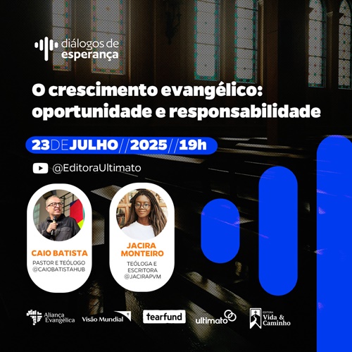 Por isso, o tema da próxima live do Diálogos de Esperança será “O crescimento evangélico: oportunidade e responsabilidade” e terá como convidados Jacira Monteiro, palestrante, escritora e teóloga e Caio Batista, teólogo e pastor.