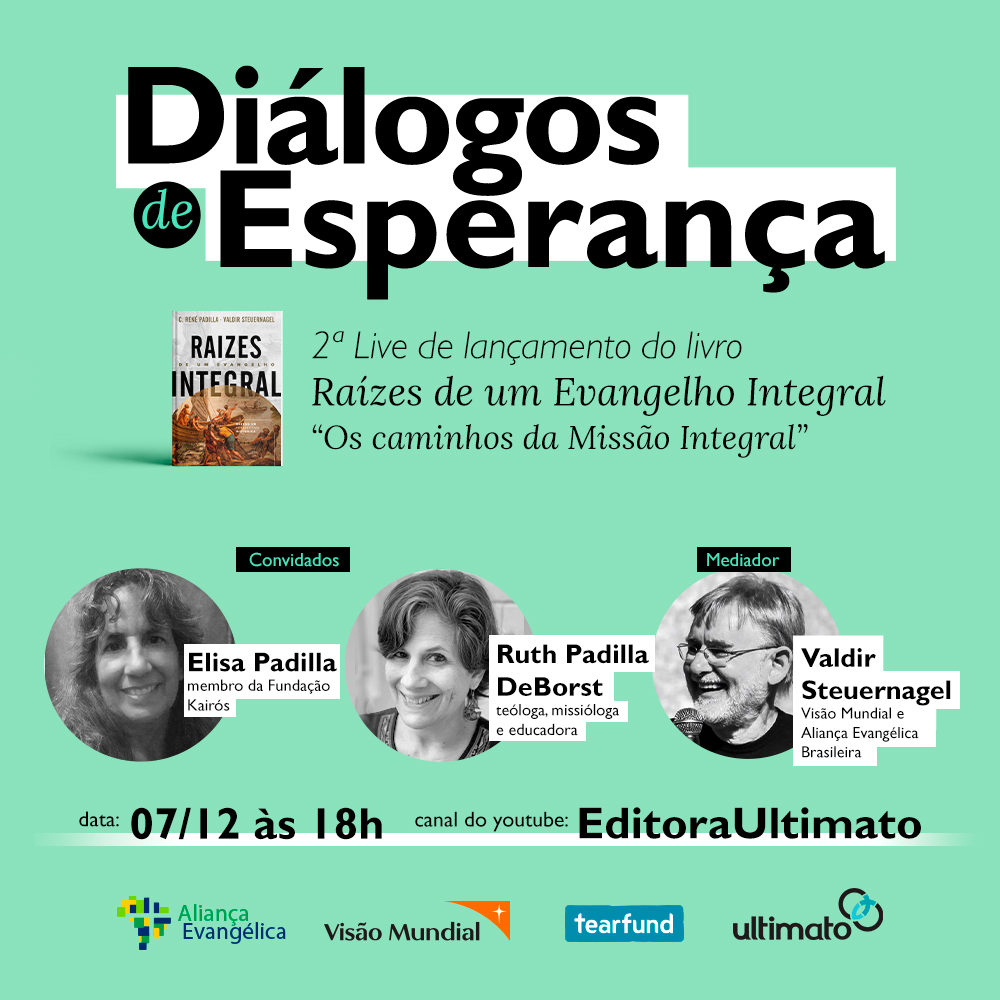 A live de Diálogos de Esperança desta terça-feira, 7 de dezembro, será às 18h com transmissão simultânea nos canais da Editora Ultimato no Youtube e Facebook.