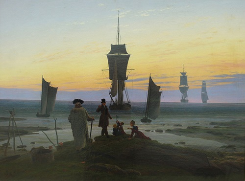 De forma reconfortante, esta pintura de Friedrich nos apresenta um cenário tranquilo voltado para o horizonte marítimo. Em um promontório rochoso baixo que se projeta para dentro de um porto, vemos um arco de cinco figuras, conforme nossos olhos se movem da esquerda para a direita. Um pouco à frente está um homem idoso olhando para o mar; em seguida, um homem de meia-idade voltado para nós, seguido por duas crianças erguendo uma bandeira e uma mulher inclinando-se em direção a elas. Todos os adultos apontam para as crianças.