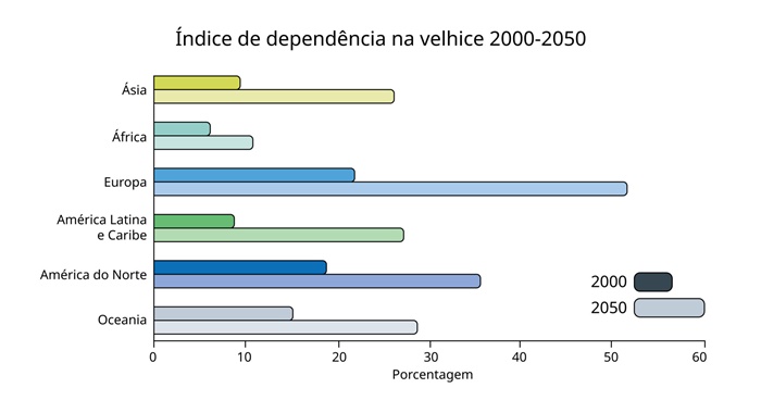O envelhecimento global será variável regionalmente, mas permanecerá uma realidade constante.3 Mesmo na região demograficamente mais jovem, a África, a proporção daqueles com 65 anos ou mais em relação aos menores de 15 anos aumentará mais rapidamente (três vezes) do que na Europa (duas vezes) ou na América do Norte (duas vezes).4