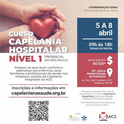 A Associação de Capelania na Saúde (ACS) está com inscrições abertas para o curso de Capelania Hospitalar Nível 1. O curso oferece capacitação para o ministério de visitação a enfermos nos hospitais com enfoque no consolo e no desenvolvimento do dom da compaixão.