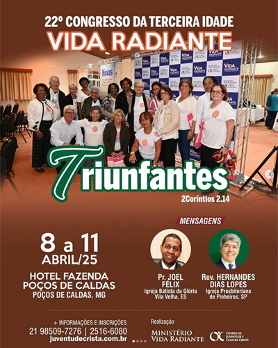 Com o tema “Triunfantes”, o 22º Congresso Vida Radiante, do Ministério Vida Radiante, acontecerá entre os dias 8 e 11 de abril de 2025, em Poços de Caldas, MG.