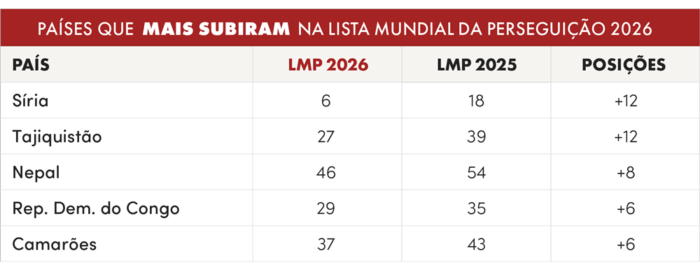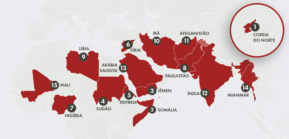 A LMP 2026 aponta 15 países classificados no nível máximo de perseguição — dois a mais que em 2025. Os novos integrantes desse grupo são: