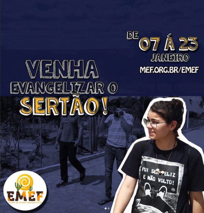 Estão abertas as inscrições para a Escola de Missões Esperança e Fé (EMEF), que acontece no período de 07 a 23 de janeiro de 2022. A Emef é um treinamento realizado pela Missão Esperança e Fé, uma organização evangélica interdenominacional que trabalha com a evangelização e plantação de novas igrejas entre os povos não alcançados do mundo, com forte atuação no sertão nordestino. Para participar é necessário ser maior de 18 anos, cumprir os protocolos exigidos pela Emef e ter recomendação da liderança pastoral.
