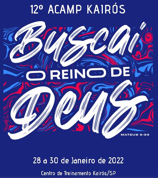 Nos dias 28, 29 e 30 de janeiro de 2022 acontece o AcampKairós, um evento voltado para jovens e que tem como objetivo trabalhar o despertamento para a vocação e o chamado missionário, para que o reino de Deus chegue às nações. Sob o tema “Buscai o Reino de Deus”, baseado em Mateus 6.33, o evento será realizado no Centro de Treinamento da Kairós, São Paulo (SP), e o programa conta com palestras sobre missões urbanas, povos indígenas, empreendedorismo missional, testemunhos de missionários de campo e muito mais. A idade mínima para participar é a partir de 16 anos.