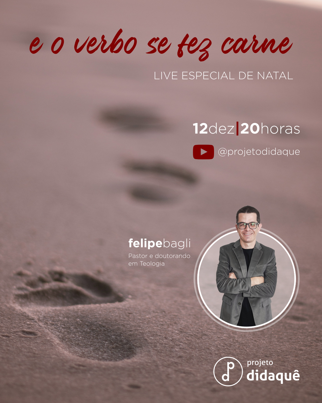 Live "e o verbo se fez carne"O Projeto Didaquê realizará na segunda-feira, 12 de dezembro, às 20h uma live gratuita com o tema "e o verbo se fez carne". Por que Deus decidiu pisar no chão da história por meio de Jesus e que rosto revelou ao mundo? Qual é o significado da encarnação? Por que há tanta dificuldade para se pensar num Jesus humano? Essas serão algumas das questões abordadas.