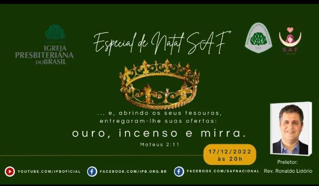 A Confederação Nacional das Sociedades Auxiliadoras Femininas (CNSAFs) da Igreja Presbiteriana do Brasil preparou um Especial de Natal no dia 17 de dezembro (sábado), às 20h. O preletor será o pastor Ronaldo Lidório. O texto de Mateus 2.11 será o tema da programação: “...e, abrindo os seus tesouros, entregaram-lhe suas ofertas: ouro, incenso e mirra”.