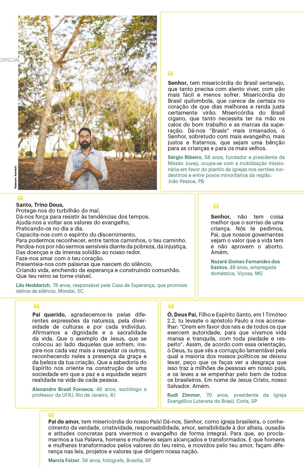 Ultimato convidou pessoas de diferentes perfis para participar da seção “Especial” da revista de setembro/outubro 2018, e escrever uma oração em favor do Brasil. Frente aos tempos difíceis que vivemos, nada mais apropriado do que interceder pela pátria amada. Você pode ler essas orações abaixo.