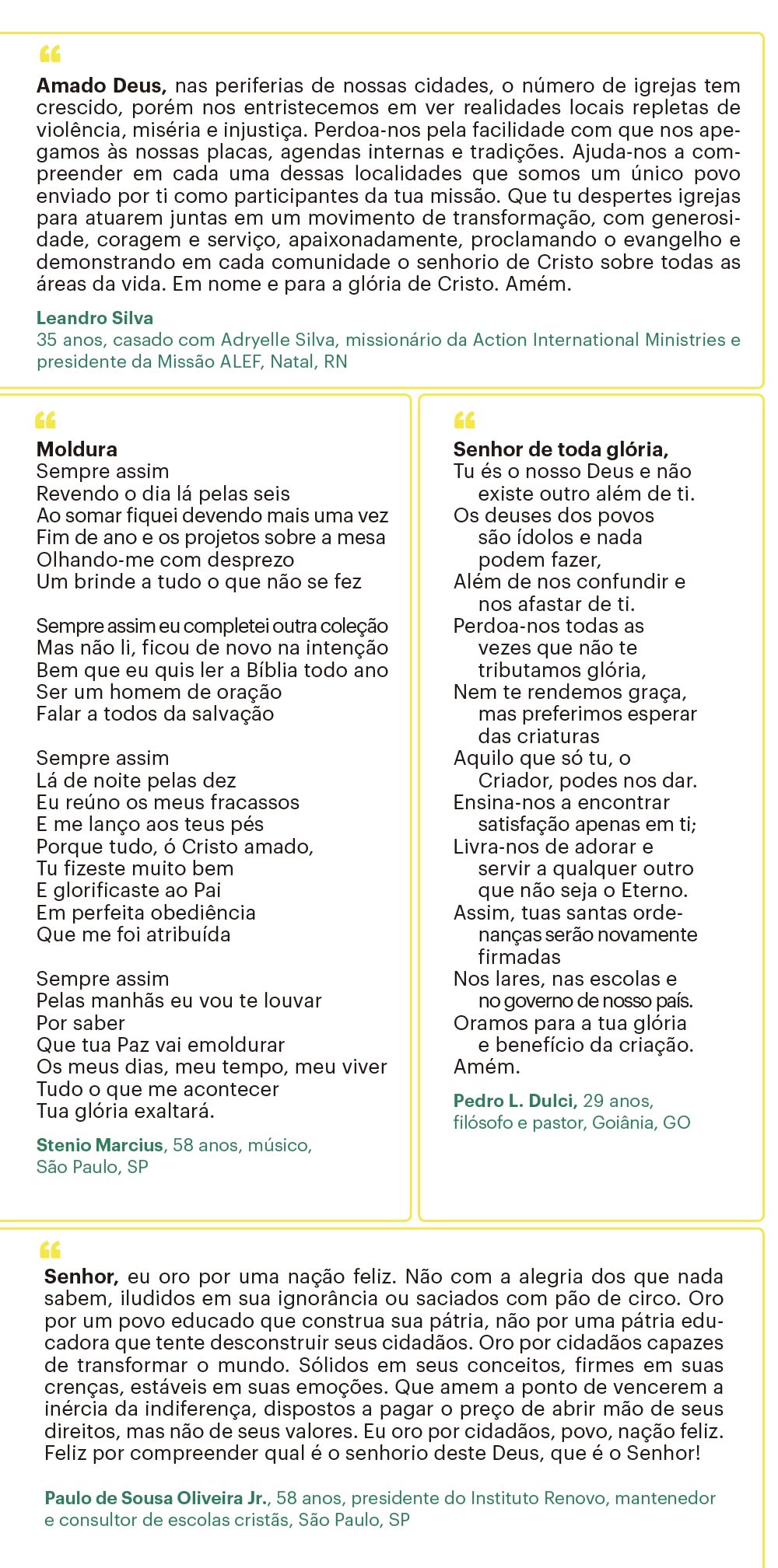 Queremos encorajar que esse exercício seja feito nas casas, nos grupos de estudos, nas organizações cristãs e nas igrejas. Certamente as orações não serão unânimes e nossos pedidos refletirão em parte nossas experiências e convicções pessoais, porém elas têm em comum o fato de que são feitas ao nosso Pai – justo, poderoso, amoroso –, em quem cremos e nas mãos de quem entregamos o futuro da nação.