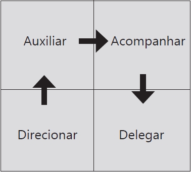 Primeiro ele colocou a palavra direcionar no quadrante inferior esquerdo. – Suponha que você contratou um novo funcionário – ele disse. – A primeira coisa que você deve fazer é dar-lhe direções. Ele precisa saber o que se espera dele e também onde as coisas ficam, como as coisas são feitas. – Então, Ken observou que se continuar apenas oferecendo direções, você falhará como líder.Depois, ele escreveu a palavra auxiliar no quadrante superior esquerdo. – Auxiliar – explicou – é quando você permite que seu funcionário veja você realizar uma tarefa antes de pedir que ele faça sozinho. É permitir que ele lhe faça perguntas e então questioná-lo para ter certeza de que ele compreendeu o que deve fazer. É dar feedback enquanto você o observa fazer seu novo trabalho.
