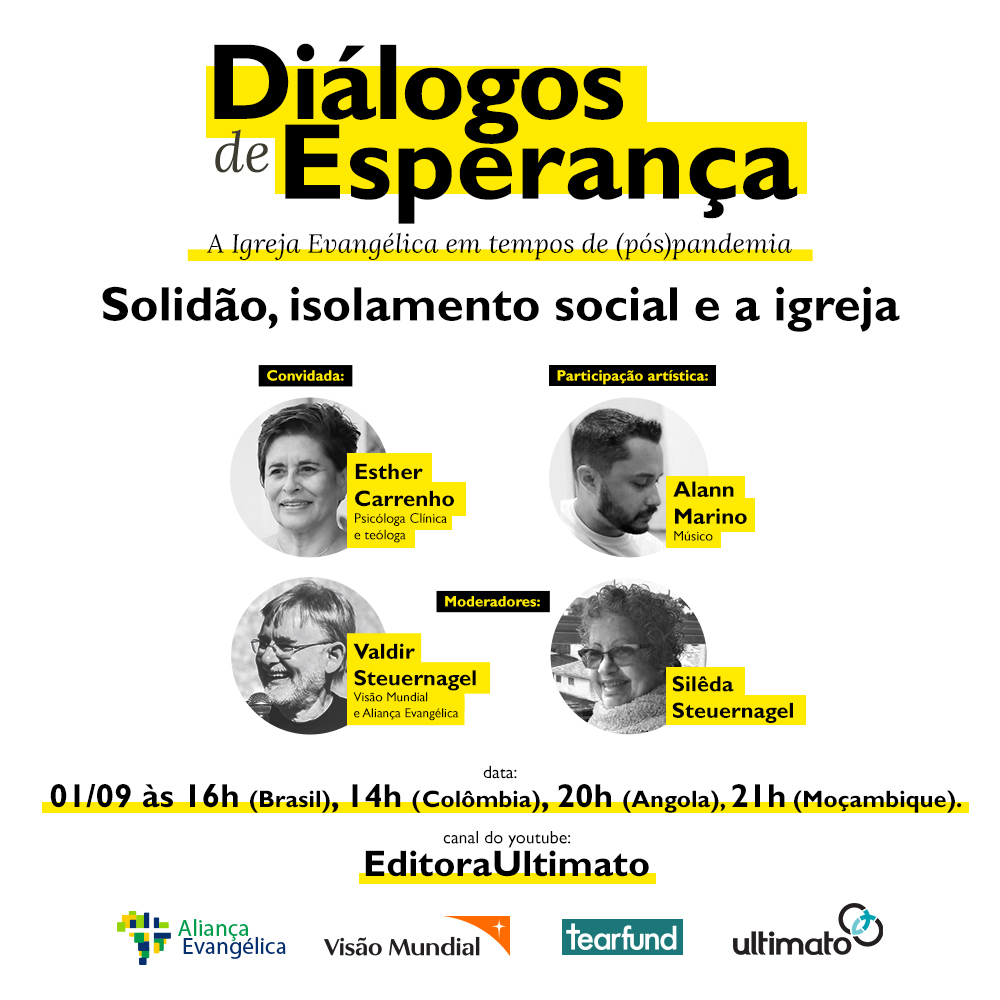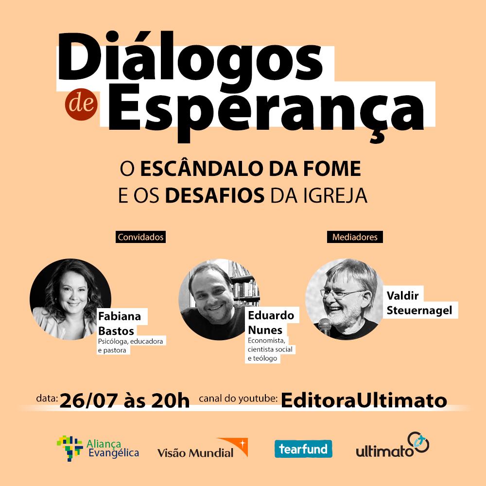 A live do Diálogos de Esperança de 26 de julho (terça-feira) acontecerá às 20h nos canais da Editora Ultimato YouTube e Facebook, simultaneamente.