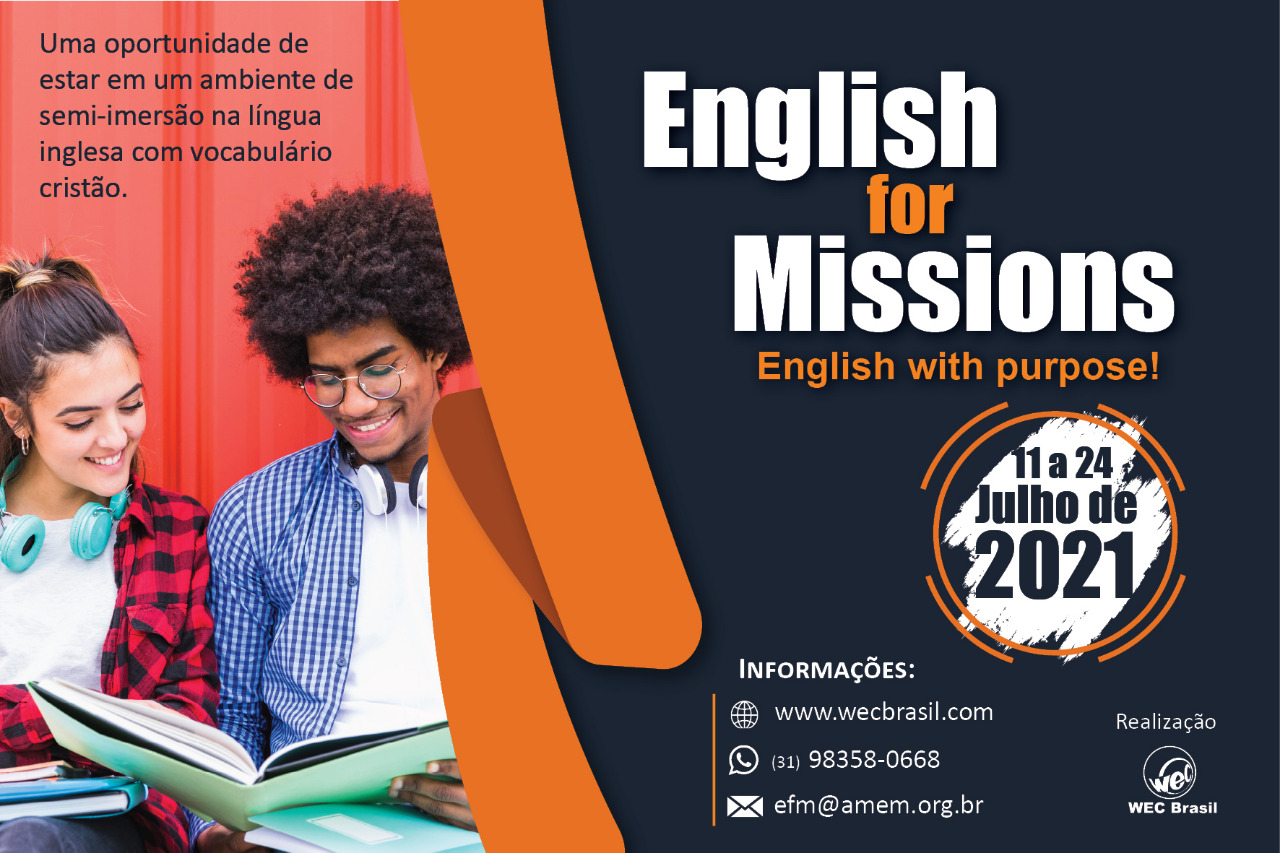 English for Missions é um curso intensivo de inglês oferecido para evangélicos acima de 18 anos. O método é de semi-imersão, com aulas de conversação (Bíblica e informação), gramática, laboratório (áudio), foco missionário, além de inúmeros programas como: Cultos, dinâmicas, passeios, vídeos, oração e intercessão, louvor e adoração, tudo, é claro, em inglês. O curso acontece de 11 a 24 de julho, em formato presencial, na base da WEC Brasil – Missão AMEM, em Belo Horizonte, Minas Gerais. Clique aqui e saiba mais.