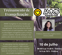 Treinamento de evangelizaçãoPromovido pela AMME Evangelizar, uma missão que desenvolve treinamentos específicos na área da evangelização, este treinamento oferece materiais que os participantes poderão usar na abordagem evangelística com crianças, jovens e adultos. A atividade é presencial, no dia 10 de julho, na Igreja Presbiteriana Cromínia, em Goiás. A missionária Angélica Avona, Diretora da AMME, é a preletora. Clique aqui e saiba mais.