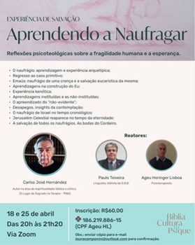 O Corpo De Psicólogos E Psiquiatras Cristãos (CPPC) promove o curso Experiência de Salvação Aprendendo a Naufragar. As aulas acontecem nos dias 18 e 25 de abril, das 20h às 21h20, via Zoom. Entre os tópicos abordados estão: “O naufrágio: aprendizagem e experiência arquetípica”; “Regresso ao caos primitivo”; “Aprendizagens na construção do Eu”; “Experiência kenótica”; e “Aprendizagens instituídas e as não-instituídas”.