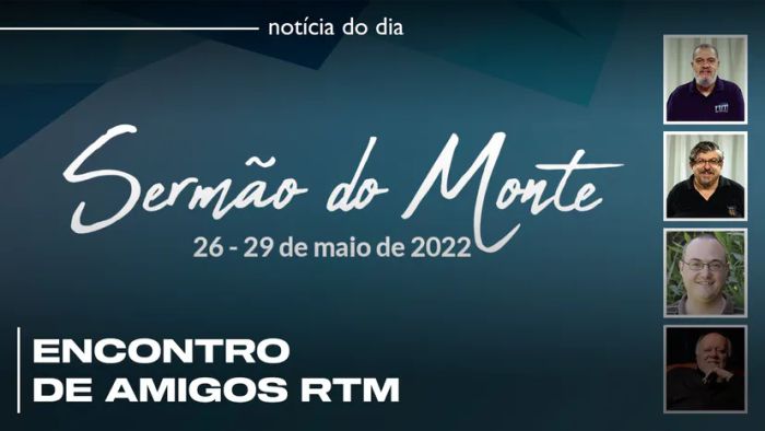 46ª edição do Retiro de Amigos da RTMEntre os dias 26 e 29 de maio de 2022, acontece a 46ª edição do Retiro de Amigos da Rádio Trans Mundial (RTM). O tema da programação será “O Sermão do Monte” e estão confirmadas as presenças do professor Luiz Sayão, do apresentador Itamir Neves e do pastor e professor Roger Wanke. O Retiro reunirá ouvintes e amigos da missão da RTM em um encontro que, além das pregações, terá a boa música de Nelson Bomilcar. O evento será realizado no Filadélfia Hospedagens e Eventos, em São Bento do Sul (SC).