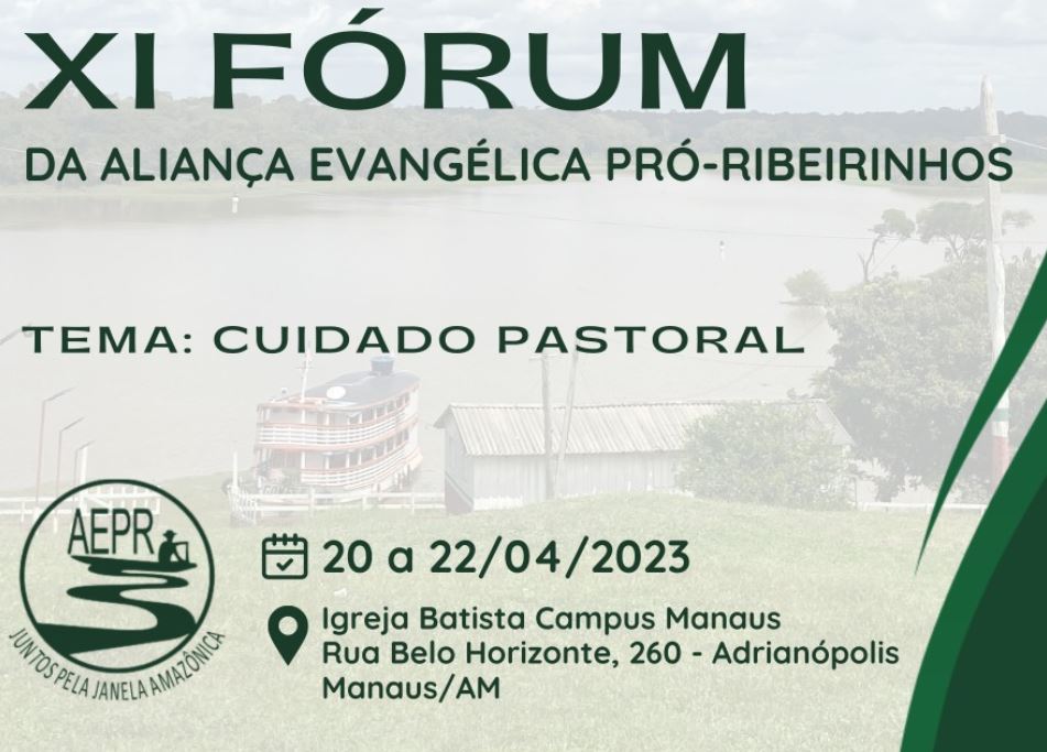 A Aliança Evangélica Pró Ribeirinhos (AEPR) realizará seu XI Fórum, de 20 a 22 de abril, com o objetivo cuidar e capacitar líderes que trabalham junto ao povo ribeirinho para o cuidado de si e de outros. A capacitação será ministrada pela equipe do Ministério Acolher que lançará o livro Cuida de ti mesmo. O evento acontecerá na Igreja Batista Campos Manaus, em Manaus, AM