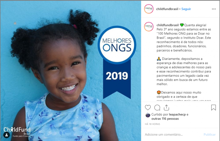 A iniciativa Melhores ONGs do Brasil, do Instituto Doar, premiou no último dia 19, na cidade de São Paulo, as 100 organizações identificadas, reconhecidas e utilizadas como inspiração para as demais entidades, com o prêmio Melhores ONGs 2019.