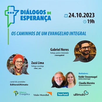 Como conjugar tudo isso em, digamos, um roteiro teológico confiável? É sobre isso o tema da próxima live do Diálogos de Esperança, no dia 24 (terça-feira), às 19h, com o título “Caminhos de um Evangelho Integral”, que terá como convidados a psicóloga, teóloga e missionária Elizete “Zazá” Lima, e o historiador, pastor e teólogo Gabriel Neres. A conversa será conduzida por Claudia Moreira e Valdir Steuernagel.
