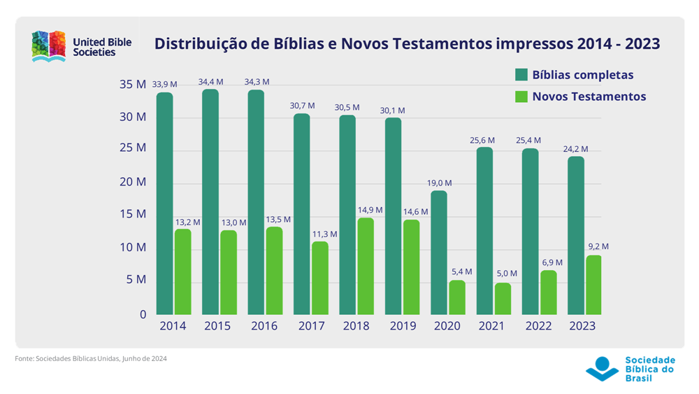 De 2014 a 2023, as Sociedades Bíblicas – que juntas formam as Sociedades Bíblicas Unidas (SBU) – distribuíram quase 300 milhões de Bíblias, 107 milhões de Novos Testamentos e 2,5 bilhões de porções, totalizando quase 3 bilhões de textos bíblicos.