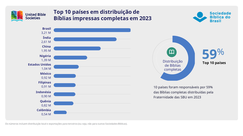 Em 2023, 59% de todas as Bíblias distribuídas pelas Sociedades Bíblicas estavam em 10 países, o Brasil continua sendo o líder na distribuição de Bíblias, com 3,2 milhões de Bíblias distribuídas. Depois do Brasil estão a Índia (2,6 milhões de Bíblias), a China (1,95 milhão de Bíblias), a Nigéria (1,39 milhão de Bíblias) e os EUA (1,04 milhão de Bíblias). Uma novidade notável entre os dez principais distribuidores é a Colômbia, que distribuiu mais de meio milhão de Bíblias em 2023.