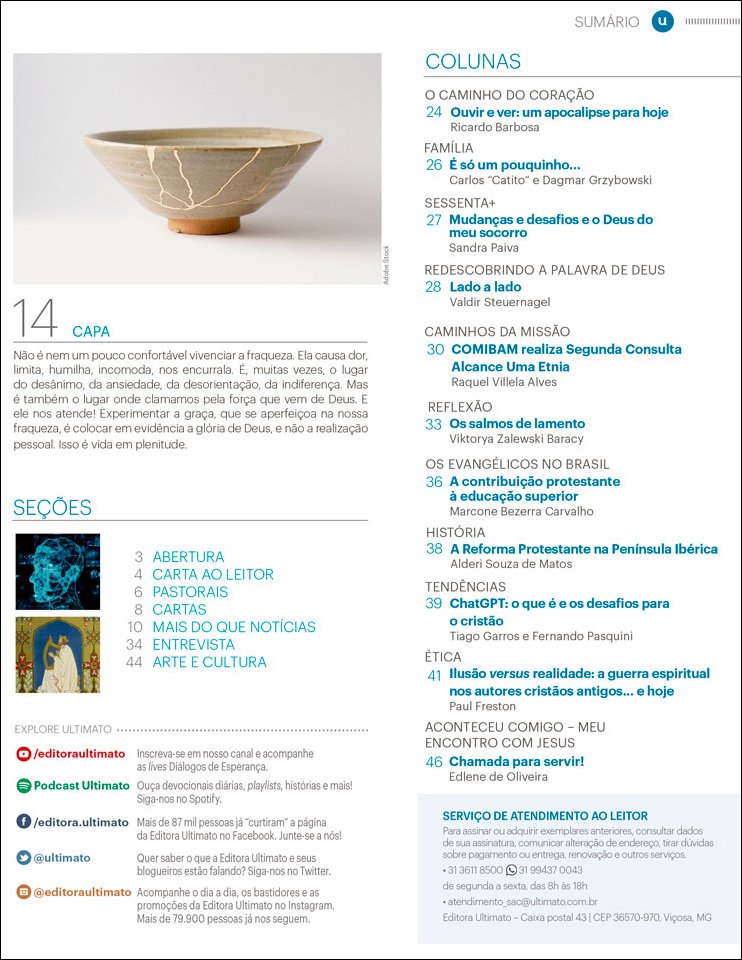 É disso que trata a matéria de capa da edição 401, de maio e junho de 2023, da revista Ultimato. “Somos todos fracos” não é um slogan, mas um chamado ao exercício da “arte do não poder”: a plena confiança num Deus bom e cuidadoso e a entrega irrestrita da existência a ele.