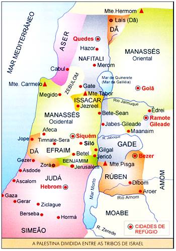 Em seguida à conquista das terras a leste do Jordão, Moisés as deu por herança às tribos de Rubem, Gade e a meia tribo de Manassés. Josué, por sua vez, repartiu com as restantes nove tribos e meia os reinos conquistados do lado ocidental do Jordão (Js 13.7-8). A tribo de Levi, separada para o sacerdócio, não recebeu território, mas somente cidades (Js 13.7-8; 14.1-5; Js 21 e I Cr 6.54-81. Calebe e o próprio Josué receberam cada um uma cidade.