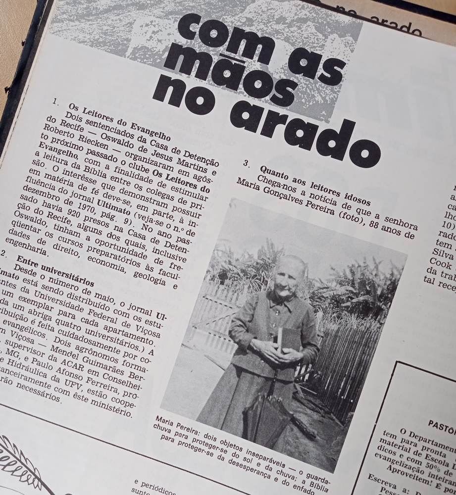 Chega-nos a notícia de que a senhora Maria Gonçalves Pereira, 88 anos, residente em Lages, SC, é leitora assídua do Ultimato. Diz ela: ‘neste jornal sim, a gente aprende bastante’. Em Jundiaí, SP, o sr. Antônio Evangelista Barbosa, mais de 90 anos, lê o jornal de ponta a ponta. Outros anciãos hão por aí fora, que leem a folha, que nos escrevem e oram por nós.”