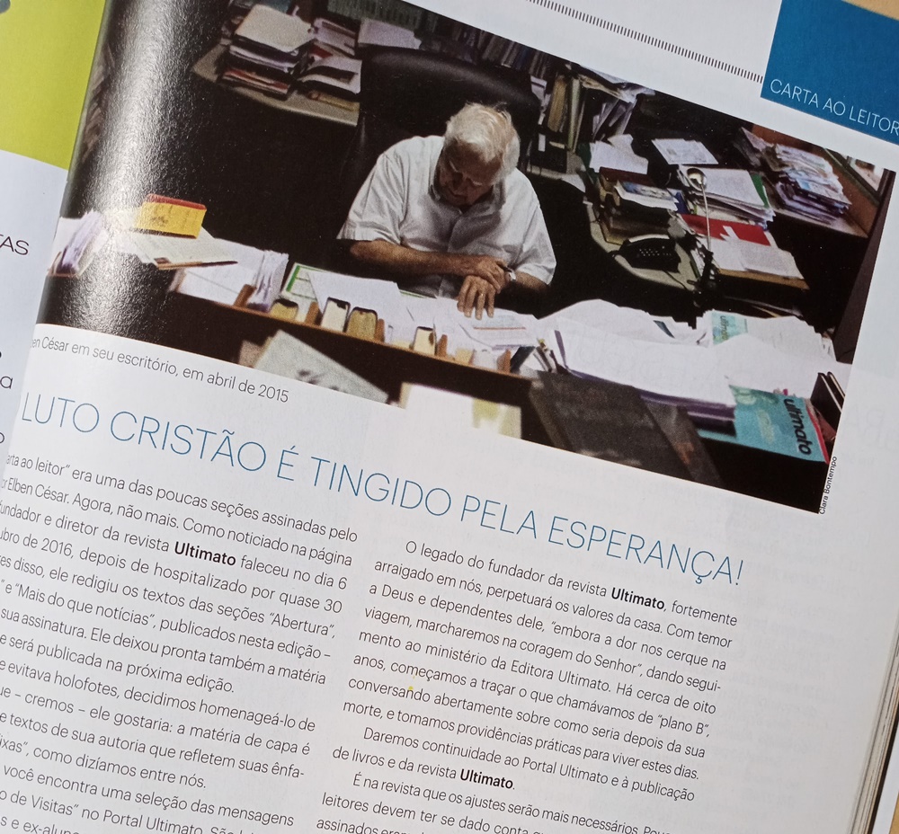 Há outros trechos e histórias. De 2020 até aqui muita coisa aconteceu: 30 edições, dezenas de colaboradores convidados, a amizade constante de colaboradores fixos, novas e antigas colunas e seções na revista e, mais recentemente, Ultimato no aplicativo.Celebre conosco!