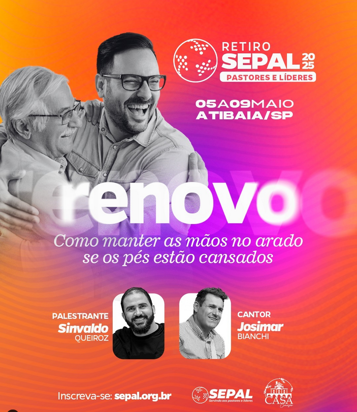 Em 2025, o retiro SEPAL do primeiro semestre acontecerá nos dias 5 a 9 de maio, em Atibaia, SP. Com o tema “Renovo – como manter as mãos no arado se os pés estão cansados”, o evento quer oferecer refrigério àqueles que mesmo com os pés cansados continuam com as mãos no arado.