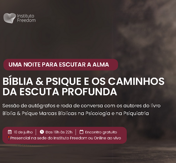 Para celebrar o lançamento do livro Bíblia e Psique – marcas bíblicas na psicologia e na psiquiatria, seis dos dezesseis coautores da obra promoverão uma noite especial com sessão de autógrafos e uma mesa de diálogo. O encontro "Bíblia & Psique e os caminhos da escuta profunda" pretende ser um momento de exposição da escrita e reflexão dos autores e de interação e troca sensível com os participantes sobre espiritualidade, saúde mental, sofrimento humano e experiências de cura.O encontro acontecerá no dia 10 de julho de 2025, das 19h às 22h, na sede do Instituto Freedom.