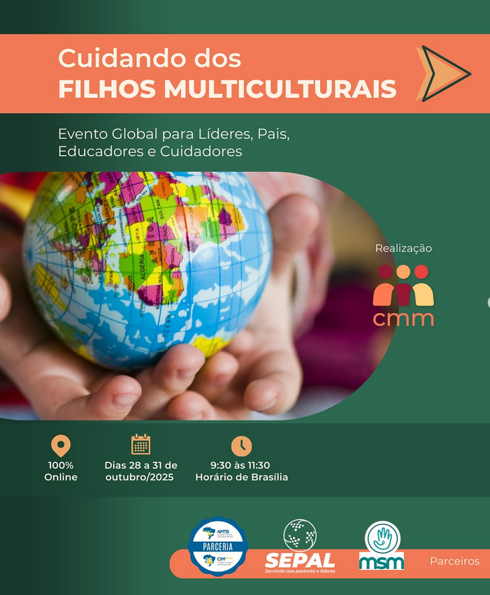 O evento global Cuidando dos Filhos Multiculturais reúne especialistas experientes para capacitar pais, cuidadores e educadores. Eles abordarão questões fundamentais que favorecem o cuidado preventivo e curativo, evitando traumas desnecessários e o abandono precoce do serviço multicultural, enquanto fortalecem a formação espiritual e emocional saudável dos filhos multiculturais.O objetivo deste evento é capacitar pais, educadores e pessoas envolvidas no cuidado dos filhos multiculturais para vermos filhos multiculturais integralmente saudáveis, florescendo e alcançando todo o potencial de Deus para a vida deles. É uma excelente oportunidade para o conhecimento qualificado, acesso a ferramentas práticas no cuidado dos filhos e famílias multiculturais, conexões entre pessoas em vivência multicultural, apoio e orientação para uma jornada multicultural mais leve e frutífera.