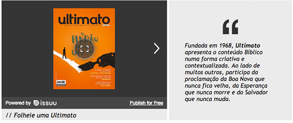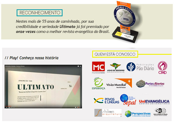 O portal ultimato.com.br traz para a Web a credibilidade e a história de mais de 40 anos de publicação ininterrupta da revista Ultimato. Com mais de 4 milhões de pageviews/mês em 2010, ultimatoonline oferece alta tecnologia, segurança e novas oportunidades de expansão e posicionamento para empresas e ministérios antes restritos a pequenas comunidades ou regiões do país.