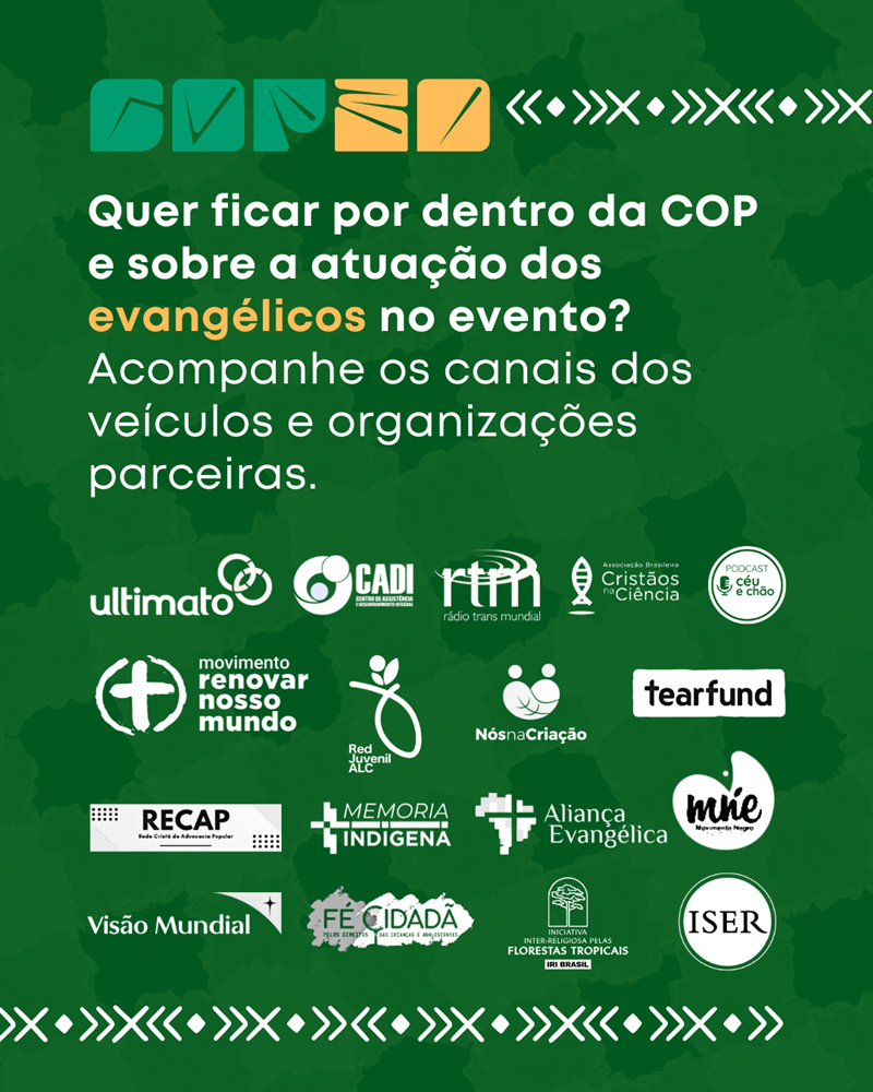 Rede de parceiros na cobertura jornalística da presença evangélica na COP30Diversos veículos de comunicação e organizações evangélicas se uniram para produzir e compartilhar conteúdos sobre a presença dos evangélicos na COP30. Participam dessa iniciativa a Editora Ultimato, a Rádio Transmundial, a Aliança Evangélica Brasileira, a Associação Brasileira de Cristãos na Ciência (ABC²), o Cadi Brasil e o podcast Céu e Chão.